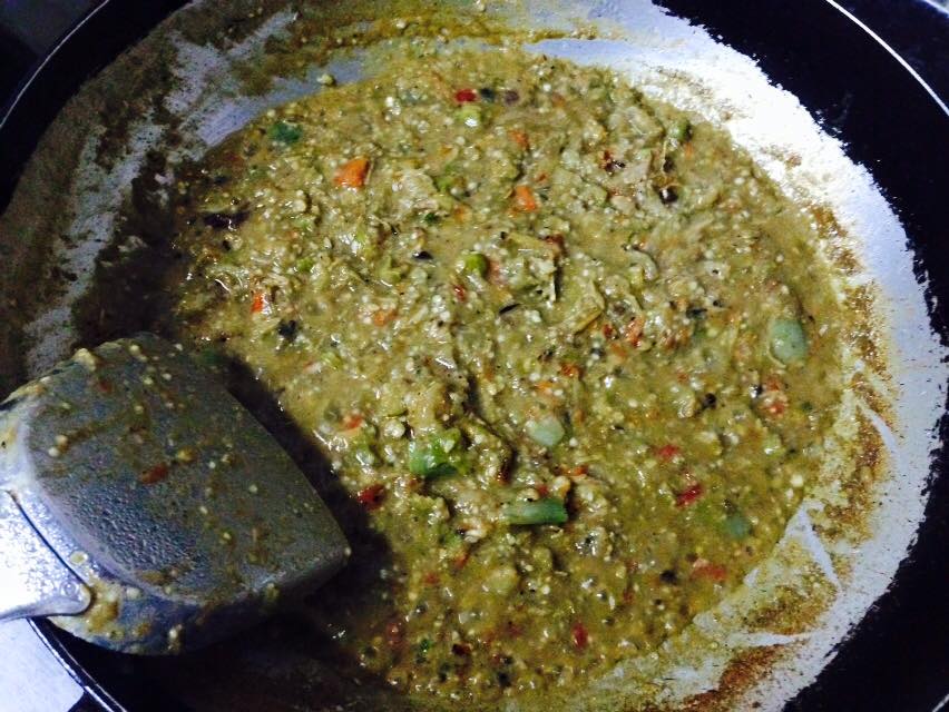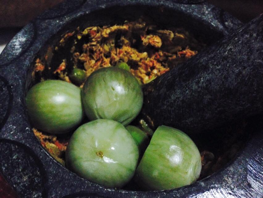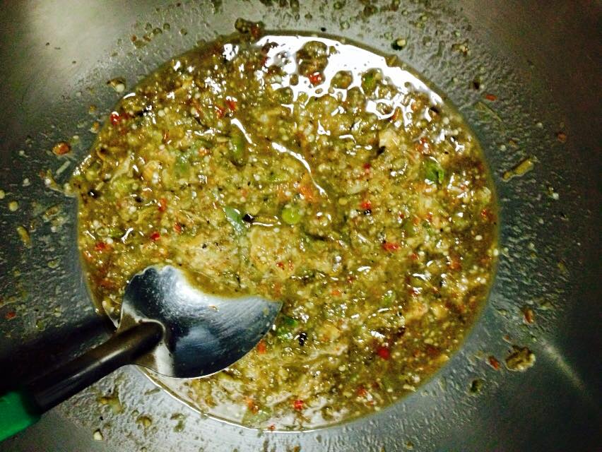 พอเฮาตำจนแหลกแล้ว กะใส่บักเขือกับบักแค้งต้มลงไปตำให้แหลก